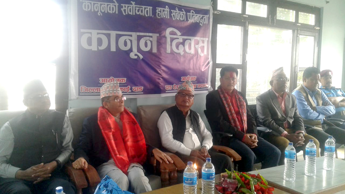 जिल्ला न्यायाधिस हेमन्त रावलको अध्यक्षतामा भएको कार्यक्रममा जिल्ला न्यायाधिस हरिप्रसाद शर्मा पंगेनी, जिल्ला समन्वय समिति दाङका प्रमुख जितेन्द्रमान नेपाली,नेपाल वार एशोसिएसनका केन्द्रीय उपाध्यक्ष सुनिल कुमार श्रेष्ठ, बार काउन्सीलका केन्द्रीय पार्षद विरबहादुर रोका, नागरिक समाज दाङका संयोजक चन्द्रराज पन्तले शुभकामना मन्तव्य व्यक्त गर्नुभएको थियो । जिल्ला बारका अध्यक्ष प्रदीप गौतमको स्वागत मन्तव्यबाट सुरु भएको कार्यक्रमको सञ्चालन श्रेष्तेदार धनीप्रसाद चपाइले गर्नुभएको थियो ।