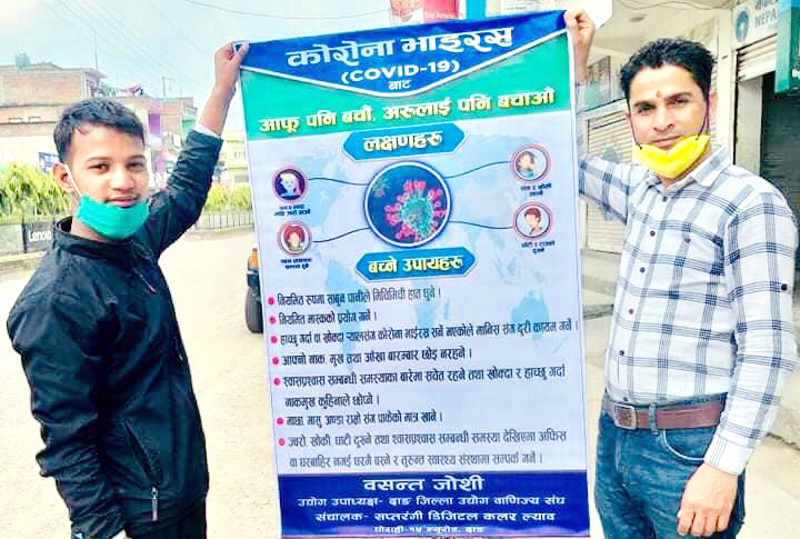 दाङ, ११ चैत । घोराहीका एक जना व्यवसायीले आफ्नो जन्मदिनको अवसरमा कोरोना भाइरसबारे जनचेतना जगाउन बोर्ड टाँसेका छन् । दाङ जिल्ला उद्योग वाणिज्य संघका उपाध्यक्ष वसन्त जोसीले जन्मदिनको अवसरमा घोराहीका विभिन्न स्थानमा १ सय ३० थान सचेतना बोर्ड टाँस्नुभएको हो ।