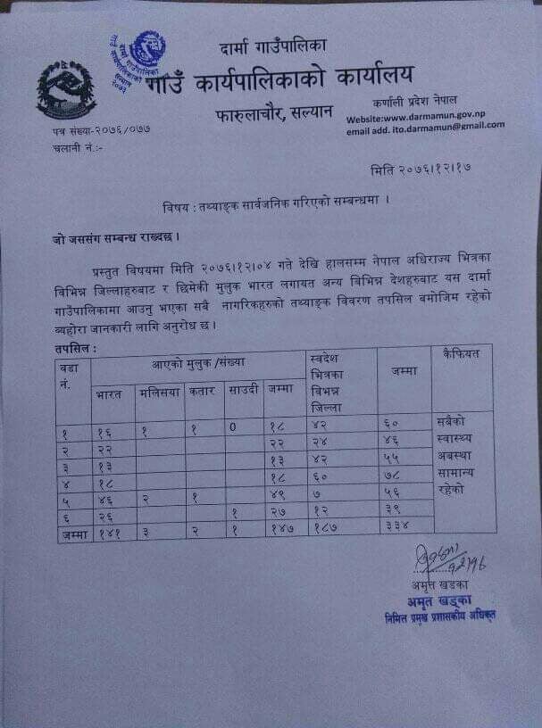 गाउँपालिकाले गएको एकहप्ताभित्र देश तथा भारतलगायत विदेशबाट आएका नागरिकहरुको तथ्याङ्क समेत सार्वजनिक गरेको छ । कोरोनाको सङ्क्रमण फैलिएपछि सबैभन्दा बढी भारतबाट नागरिक फर्किएको तथ्याङ्क गाउँपालिकाले सार्वजनिक गरेको छ । जसमा भारतबाट १४१ जना, मलेसियाबाट ३ जना, कतारबाट २ जना, साउदीबाट १ जना र देशभित्रकै विभिन्न स्थानबाट १८७ जना गरी जम्मा ३ सय ३४ जना गाउँपालिका भित्रिएको गाउँपाकिलाका निमित्त प्रमुख प्रशासकीय अधिकृत अमृत खड्काले जानकारी दिनुभयो ।