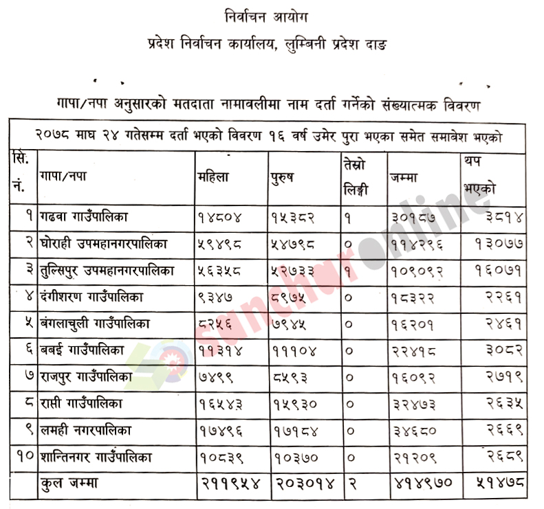 त्यस्तै गढवा गाउँपालिकामा ३ हजार ८ सय १४ जना, दङ्गीशरण गाउँपालिकामा २ हजार २ सय ६१ जना, बङ्गलाचुली गाउँपालिकामा २ हजार ४ सय ६१ जना, बबई गाउँपालिकामा ३ हजार ८२ जना, राजपुर गाउँपालिकामा २ हजार ७ सय १९ जना, राप्ती गाउँपालिकामा २ हजार ६ सय ३५ जना र शान्तिनगर गाउँपालिकामा २ हजार ६ सय ८९ जना मतदाता थपिएका छन् । १६ वर्ष काटेका तथा १८ वर्ष पूरा नभएका व्यक्तिहरुको समेत नाम समावेश भएको हुँदा आउँदो चुनावमा सहभागी हुने मतदाताको सङ्ख्या भने केही घट्ने कार्यालयले जनाएको छ ।