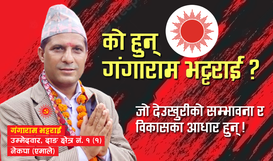 गंगाराम भट्टराई दाङ देउखुरीका लागि एउटा नाम मात्रै होइन, ब्राण्ड बनिसकेको छ । सामाजिक क्षेत्रमा निकै सक्रिय गंगाराम भट्टराई अहिले निर्णायक राजनितीक यात्रामा अघि बढ्नु भएको छ । नेकपा एमाले लुम्बिनी प्रदेश कमिटी सदस्य भट्टराई मंसिर ४ गते हुदै गरेको प्रदेश सभा सदस्य प्रत्येक्ष निर्वाचनमा दाङ क्षेत्र नम्बर १(१) को प्रदेश सभा सदस्यको उम्मेदवार हुनुहुन्छ । राजनैतिक नेतृत्व बाट समाज विकास, सुशासन, पारदर्शिता, जवाफदेहीता, सेवा प्रवाहमा चुस्तता कायम गराउदै लुम्विनी प्रदेश राजधानी ब्यवस्थापन तथा अविलम्व कार्य सम्पादन संचालनका लागी उहाँको उम्मेदवारी हो ।