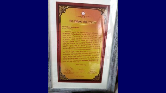 घोराही, २० जेठ । दाङकाे घाेराही उप-महानगरपालिका वडा नम्बर ५ धारपानीस्थित पाण्डवेश्वर महादेव मन्दिरलाई रण अम्बिका शाह सेवा पुरस्कार प्रदान गरिएको छ । रण अम्बिका शाह सेवा गुठी काठमाडौंले एक कार्यक्रमका बीच मन्दिरका अध्यक्ष गणेश कुमार अधिकारी र सचिव विष्णुराम आचार्यलाई साे पुरस्कार प्रदान गरेकाे हाे ।