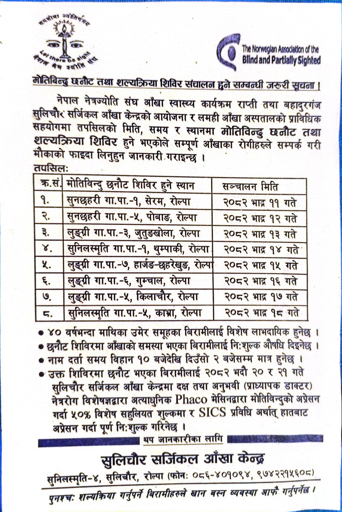 थप जानकारीका लागि सुलिचौर सर्जिकल आँखा केन्द्र, सुनिलस्मृति–४, रोल्पामा सम्पर्क गर्न सकिने छ (फोनः ०८६–४०१०९४, ९७४२२१५६०८)