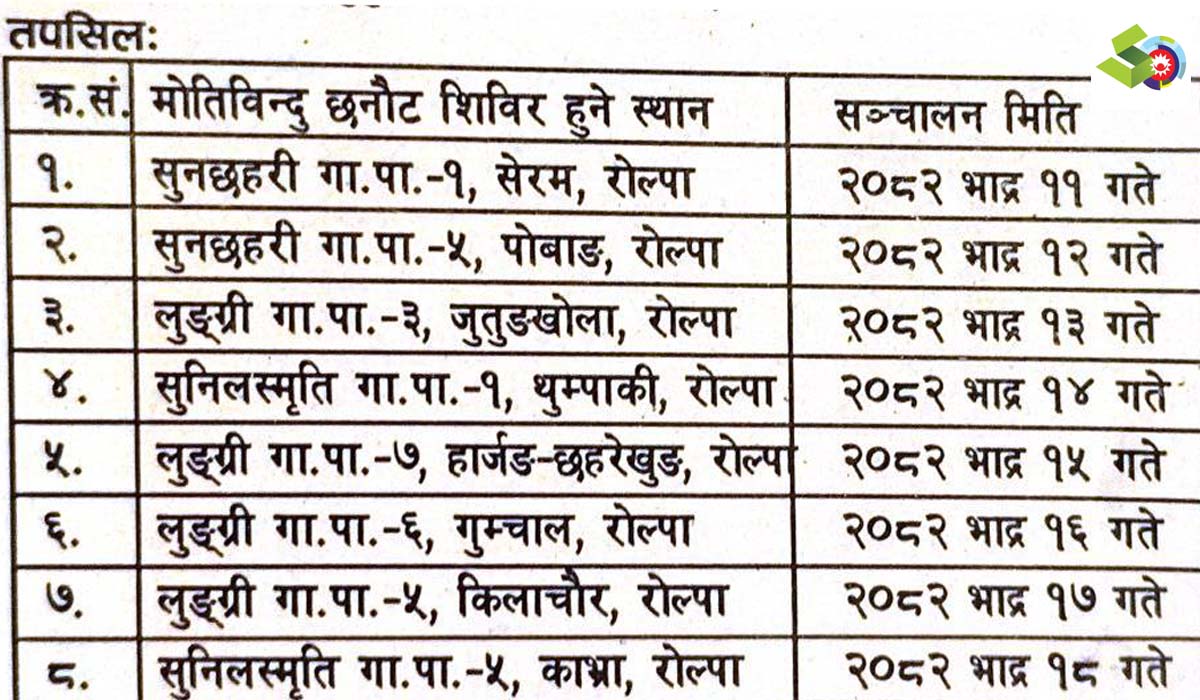 रोल्पा, भदौ ११ । नेपाल नेत्रज्योति संघ आँखा स्वास्थ्य कार्यक्रम राप्ती तथा बहादुरगंज सुलिचौर सर्जिकल आँखा केन्द्रको आयोजना र लमही आँखा अस्पतालको प्राविधिक सहयोगमा रोल्पाका विभिन्न स्थानमा मोतिबिन्दु छनौट तथा शल्यक्रिया शिविर सञ्चालन हुने भएको छ।