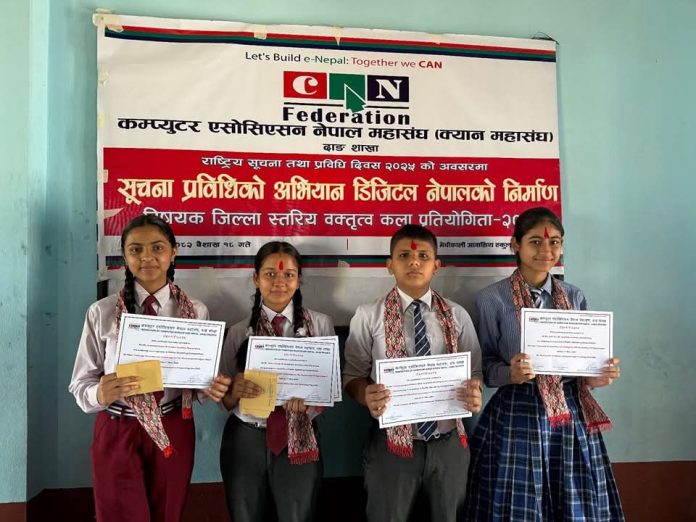 घोराही, १९ वैशाख । कम्प्युटर एसोसिएसन नेपाल (क्यान महासंघ) दाङ शाखाको आयोजनामा बिहीबार राष्ट्रिय सूचना तथा प्रविधि दिवस २०८२ (२०२५) को अवसरमा “सूचना प्रविधिको अभियान, डिजिटल नेपालको निर्माण” विषयक वक्तृत्वकला प्रतियोगिता मेचीकाली आवासीय विद्यालय, घोराहीमा सम्पन्न भएको छ।