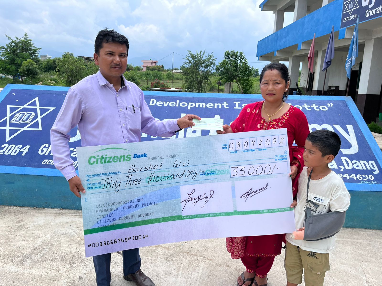 शिखर इन्स्योरेन्स कम्पनी घाेराहीले विद्यालयकाे खातामा दुर्घटना बिमावापत उपलब्ध गराएकाे ३३ हजार रकमकाे चेक बिमित छात्र बर्षात गिरिलाई प्रदान गरिएकाे थियाे ।