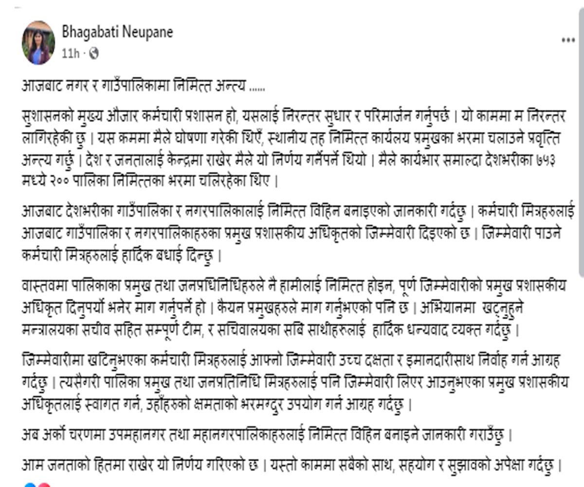 सुशासनको मुख्य औजार कर्मचारी प्रशासन भएकाले यसलाई निरन्तर सुधार र परिमार्जन गर्ने काममा आफू लागिरहेको उहाँले फेसबुकमा लेख्नुभएको छ । आफू मन्त्री बन्दै गर्दा सबै पालिकामा प्रमुख प्रशासकीय अधिकृत खटाउने भनेर गरेको घोषणा कार्यान्वयन गरिएको उहाँको भनाइ छ ।