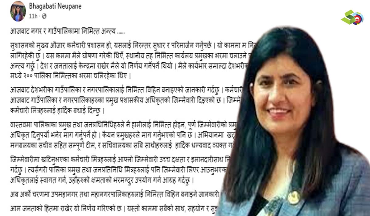 काठमाण्डौ, भदाै १३ । सङ्घीय मामिला तथा सामान्य प्रशासनमन्त्री भगवती न्यौपानेले अब कुनै पनि पालिकामा निमित्त प्रमुख प्रशासकीय अधिकृत नरहने घोषणा गर्नुभएको छ । निमित्तको भरमा सञ्चालन भइरहेका देशभरका दुईसय पालिकामा प्रमुख प्रशासकीय अधिकृत खटाइएको जानकारी दिंदै उहाँले यो घोषणा गर्नुभएको हो ।