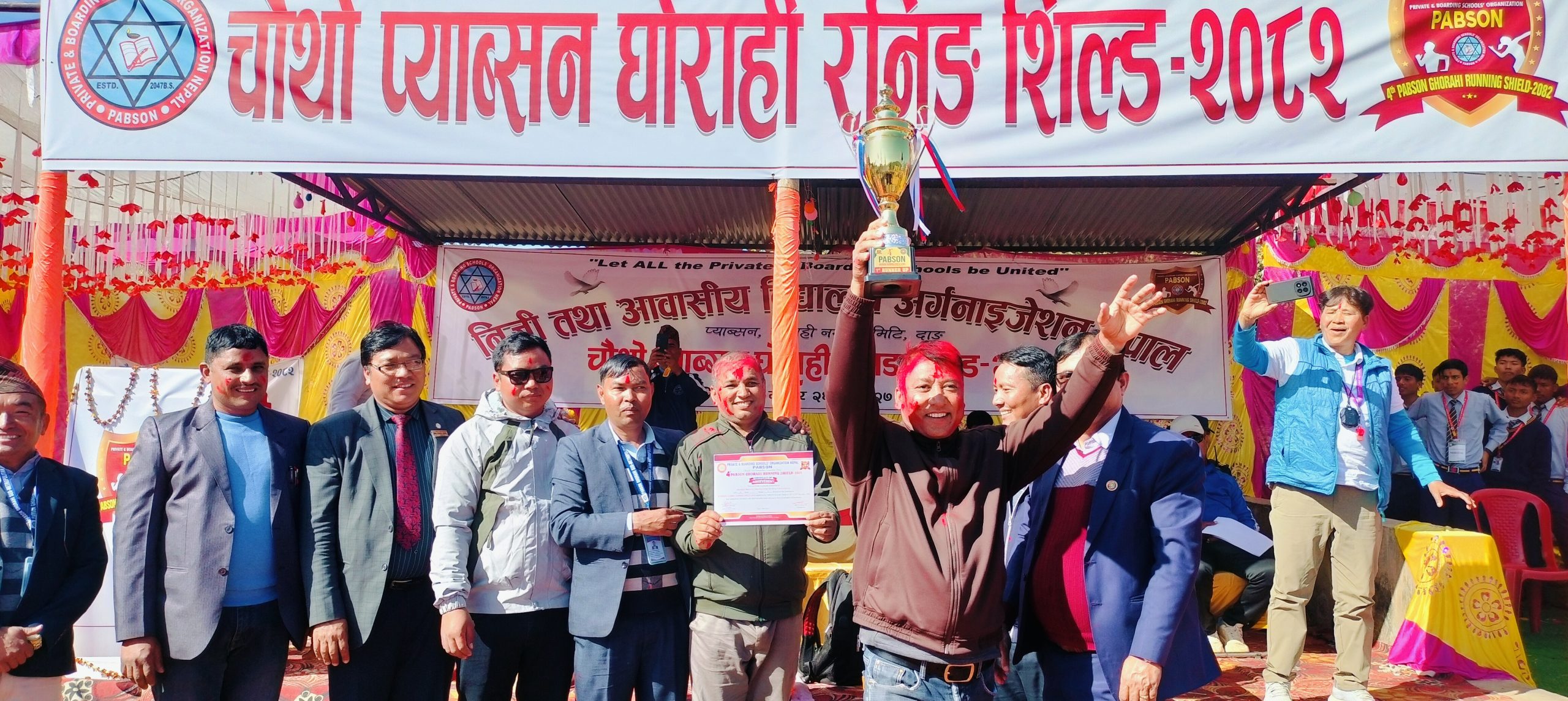 घाेराही, २८ मंसिर । निजी तथा आवासीय विद्यालय अर्गनाइजेसन नेपाल (प्याब्सन) घाेराही नगर कमिटीकाे आयाेजनामा सञ्चालित चाैथाे प्याब्सन घाेराही रनिङ सिल्ड सम्पन्न भएकाे छ। खेलकाे अन्तिम परिणाम अनुसार गाेर्खा इन्टरनेसनल पब्लिक सेकेन्डरी स्कुल विजेेता र मेचीकाली सेकेन्डरी बाेर्डिङ स्कुल उपविजेता भएका छन् ।
