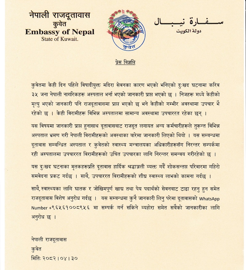 दूतावासले विज्ञप्ति निकालेर विषाक्त रक्सी सेवनबाट केही नेपालीको निधन भएको र ३५ जना अस्पताल भर्ना भएको भन्दै यस्तो आग्रह गरेको हो ।