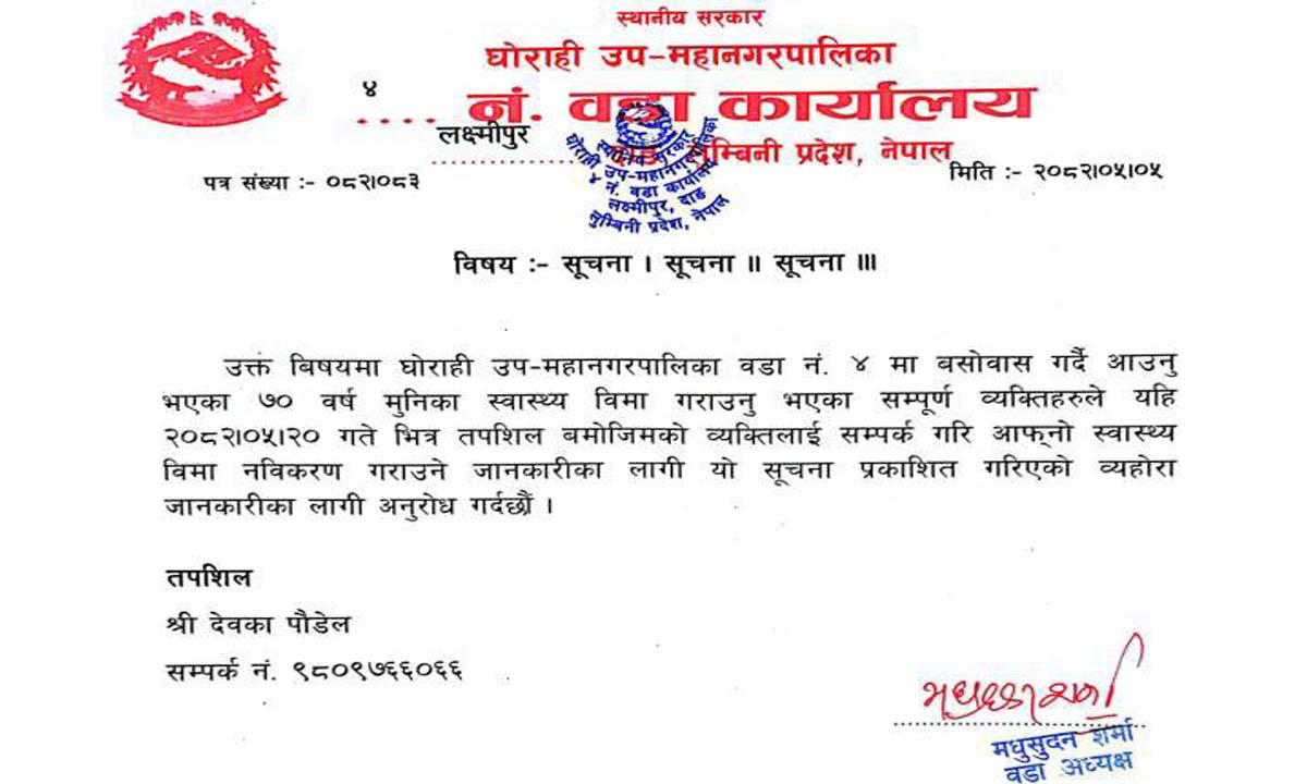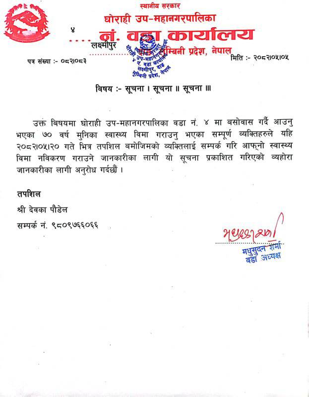 घाेराही, भदाै ५ । घोराही उपमहानगरपालिका वडा नम्बर ४ ले ७० वर्ष मुनिका स्वास्थ्य बीमा गराएका सम्पूर्ण व्यक्तिहरूलाई निर्धारित म्यादभित्र बीमा नवीकरण गर्न आग्रह गरेको छ। वडा कार्यालयले जारी गरेको सूचनामा भदौ २० गतेभित्र स्वास्थ्य बीमा नवीकरण गर्नुपर्ने र यसका लागि तोकिएका व्यक्तिलाई सम्पर्क गर्न सकिने उल्लेख गरिएको छ।