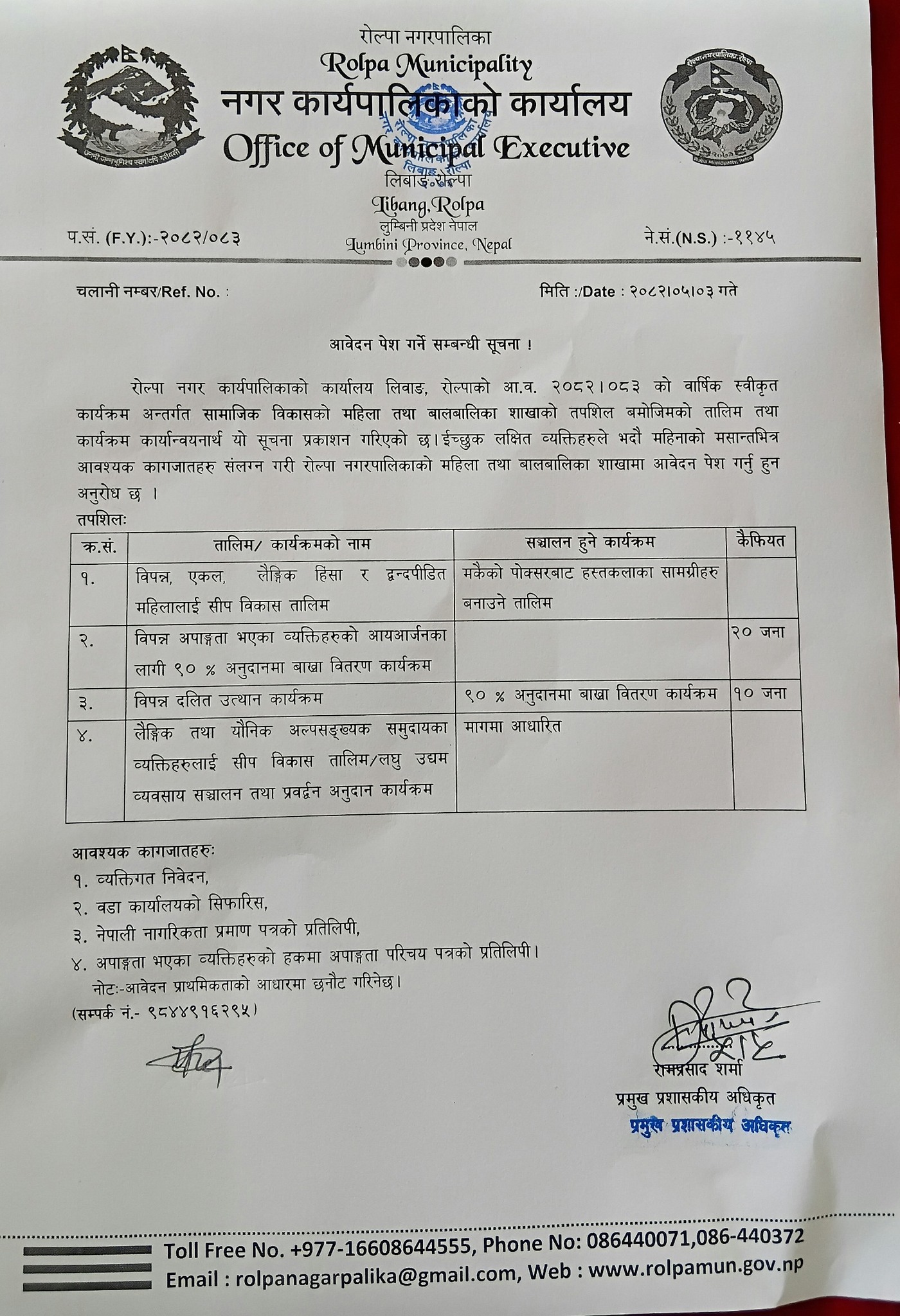 राेल्पा, भदाै ६ । रोल्पा नगरपालिका, लिबाङले आ.व. २०८२/८३ अन्तर्गत महिला तथा बालबालिका शाखाबाट विभिन्न तालिम तथा कार्यक्रम सञ्चालन गर्ने भएको छ।