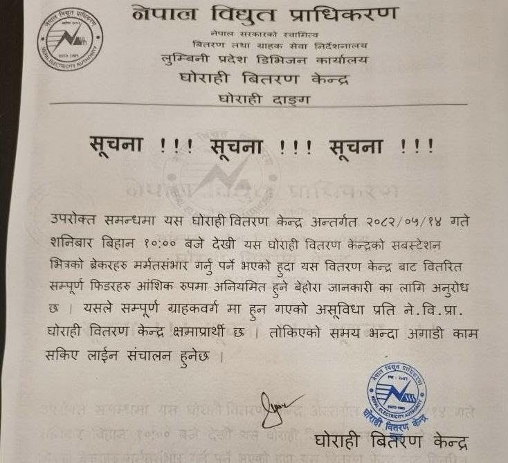 वितरण केन्द्रका अनुसार २०८२ भदौ १४ गते (शनिबार) बिहान १०:०० बजेदेखि घोराही वितरण केन्द्रको सबस्टेशन भित्रका ब्रेकरहरू मर्मत–सम्भार गर्नुपर्ने भएकाले सम्पूर्ण फिडरहरूमा आंशिक रुपमा अनियमित विद्युत आपूर्ति हुने भएको हो।