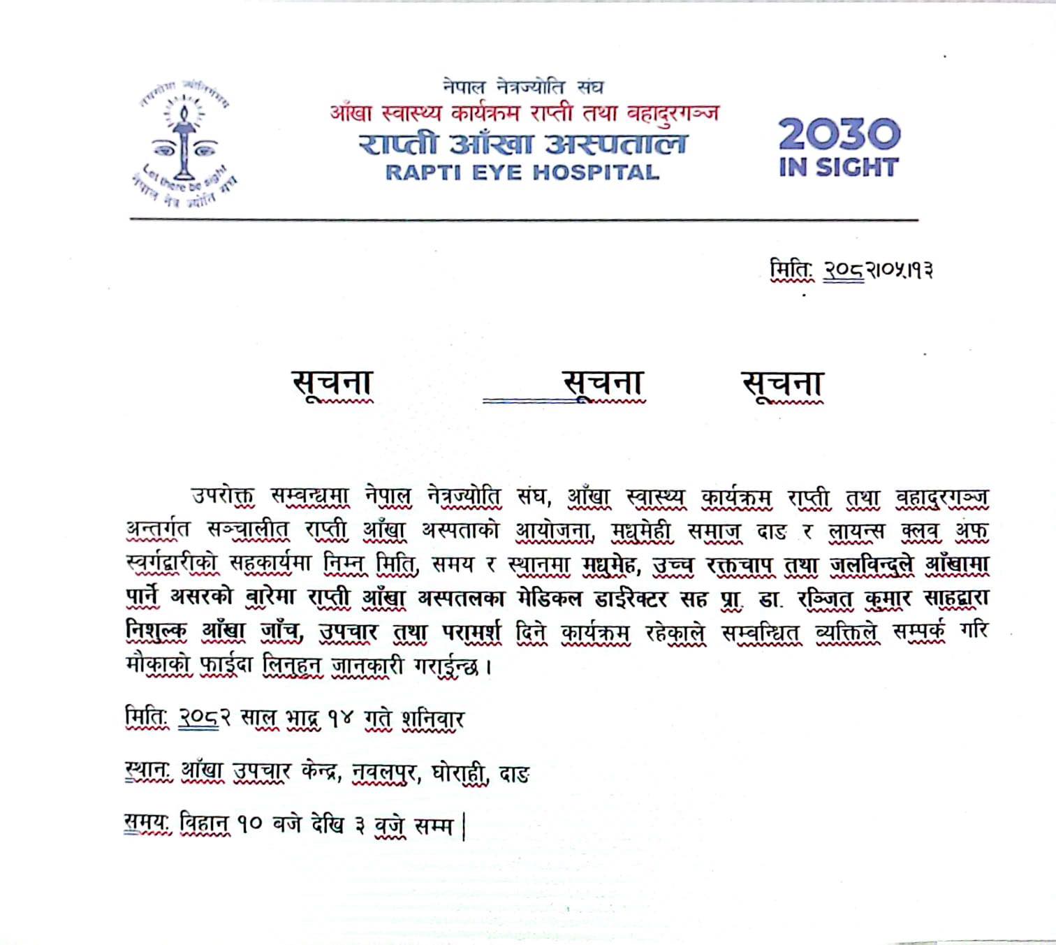 घाेराही, भदाै १३ । नेपाल नेत्रज्योति संघ, आँखा स्वास्थ्य कार्यक्रम राप्ती तथा बहादुरगञ्ज अन्तर्गत सञ्चालित राप्ती आँखा अस्पतालले निःशुल्क आँखा स्वास्थ्य परामर्श तथा उपचार कार्यक्रम सञ्चालन गर्ने भएको छ।