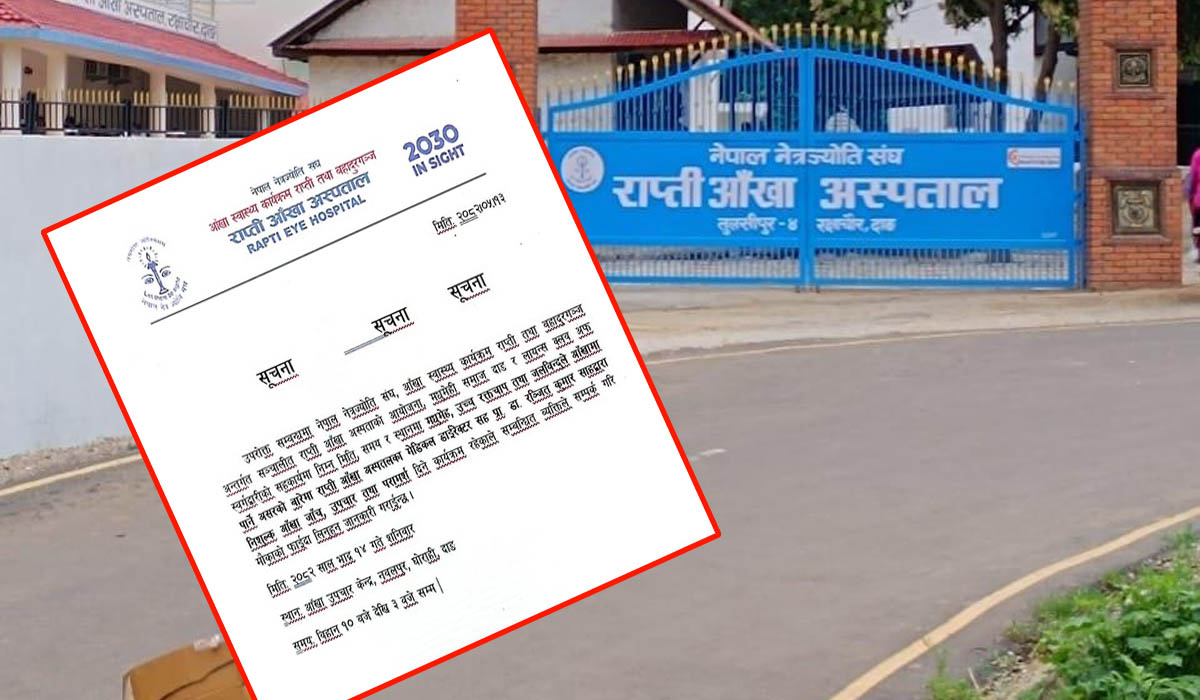 राप्ती आँखा अस्पतालका मेडिकल डायरेक्टर सह–प्रा. डा. रञ्जित कुमार साहले मधुमेह, उच्च रक्तचाप तथा जलविन्दुले आँखामा पार्ने असरबारे सचेतना दिँदै निःशुल्क आँखा जाँच, उपचार र परामर्श प्रदान गर्ने कार्यक्रम रहेको अस्पतालले जनाएको छ।