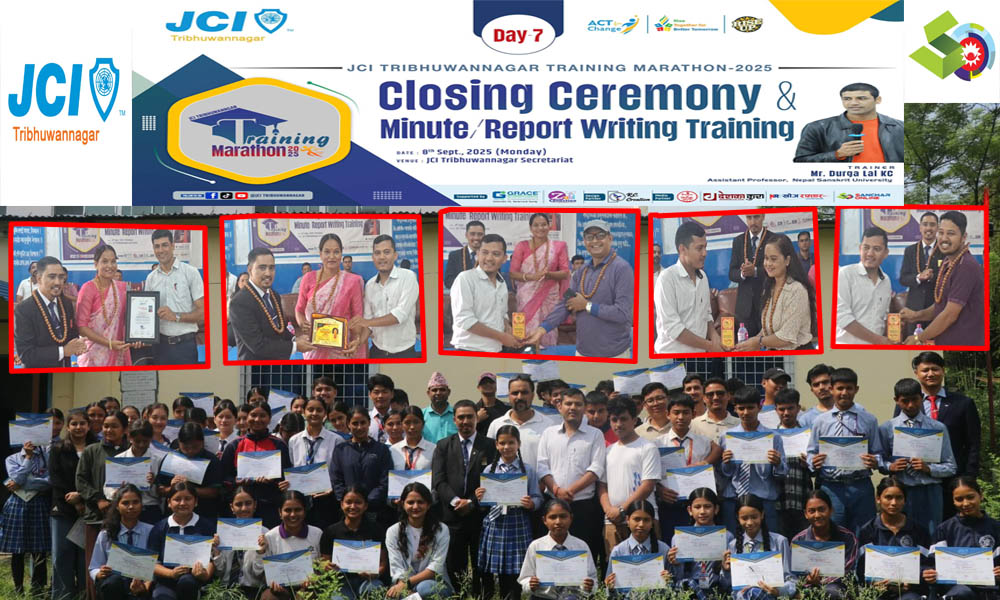 अन्तिम दिन (भदौ २३ गते) त्रिभुवननगर जेसीज कार्यालयमा “माइन्यूट तथा प्रतिवेदन लेखन” विषयमा प्रशिक्षण दिइएपछि ‘तालिम म्याराथन–२०२५’ विधिवत् रूपमा समापन गरिएको हो।