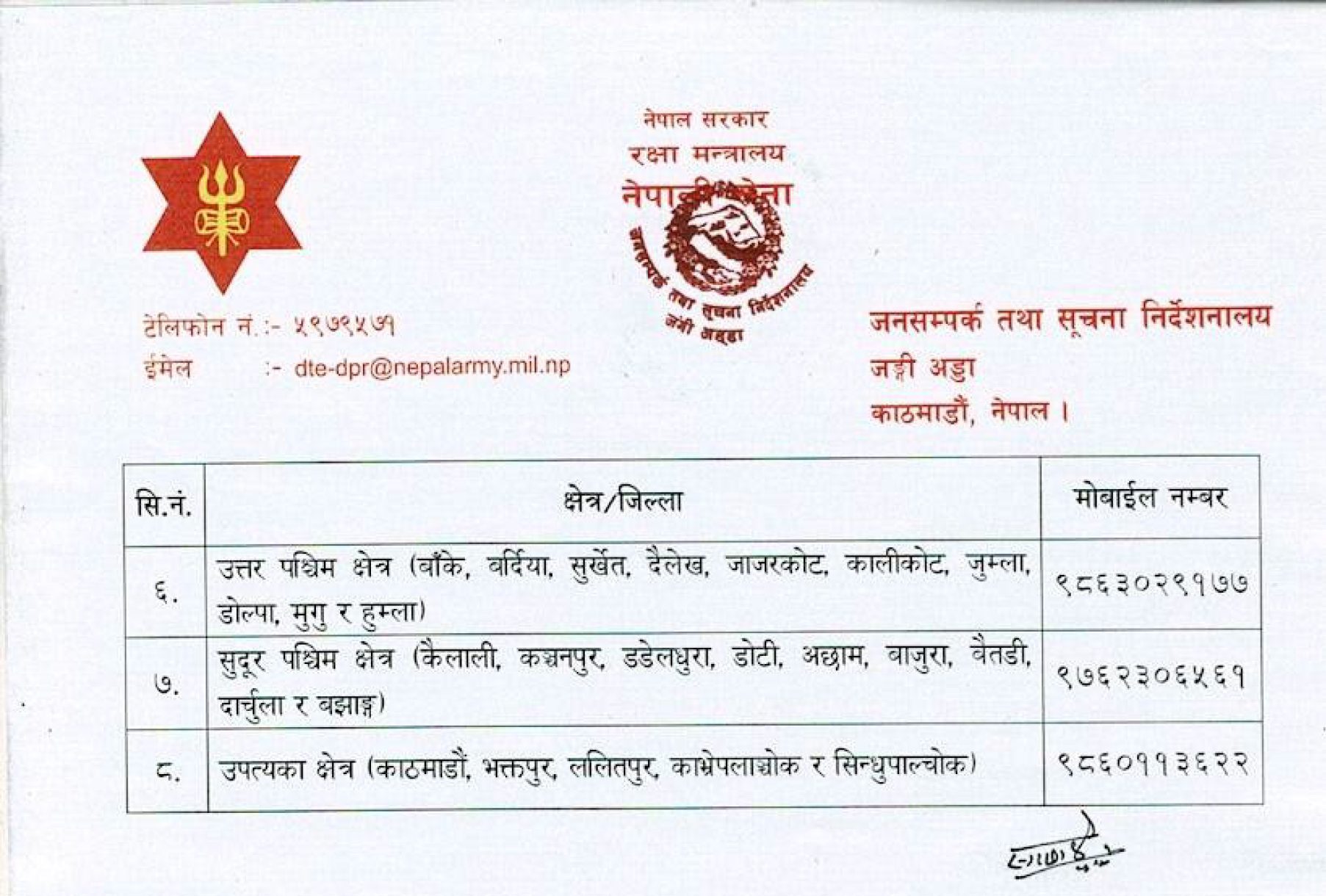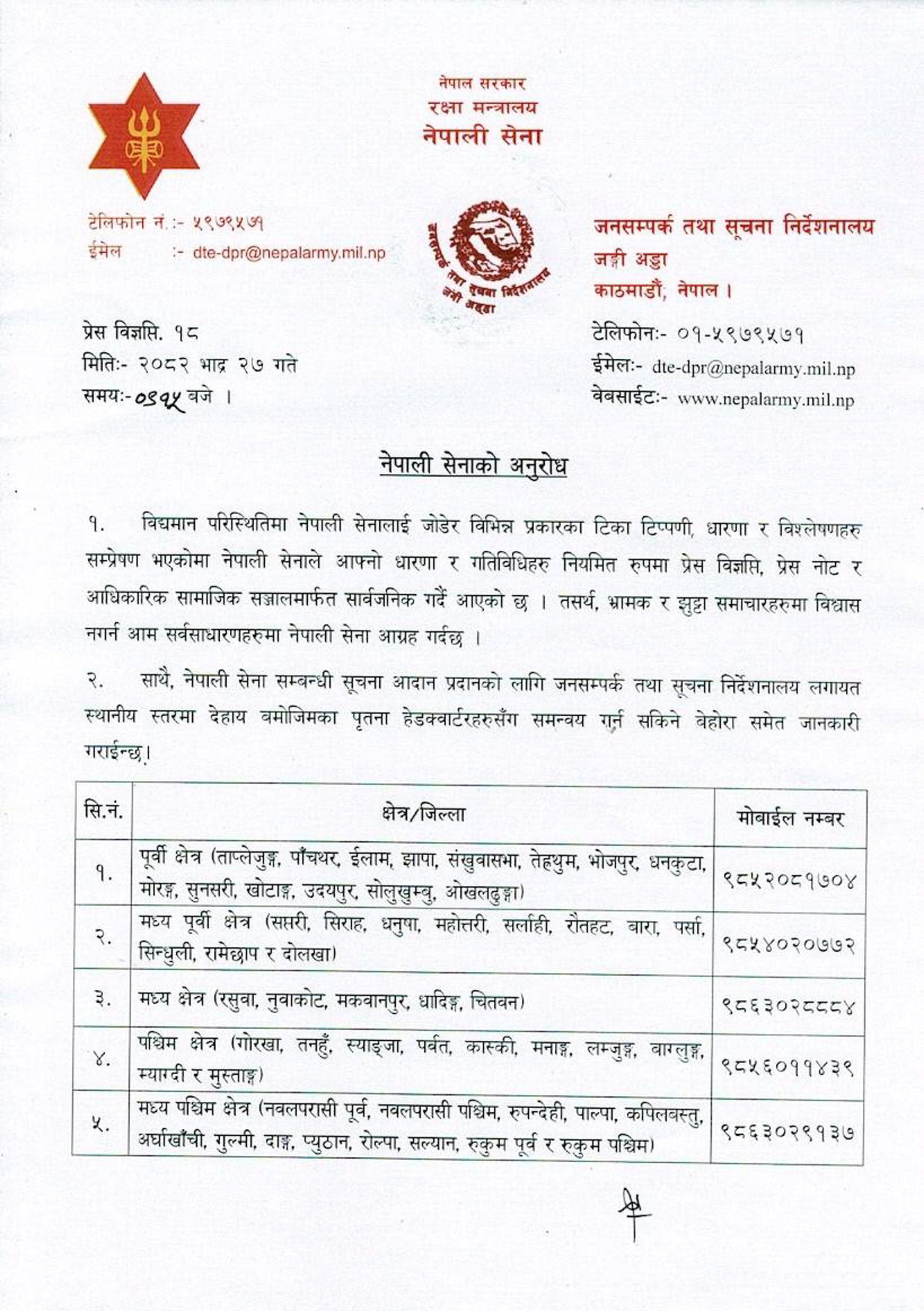 नेपाली सेनाले एक सूचना जारी गर्दै जनसम्पर्क तथा सूचना निर्देशनालयलगायतका स्थानीय स्तरमा पृतना हेडक्वार्टरसँग समन्वय गर्न पनि अनुरोध गरेको छ।