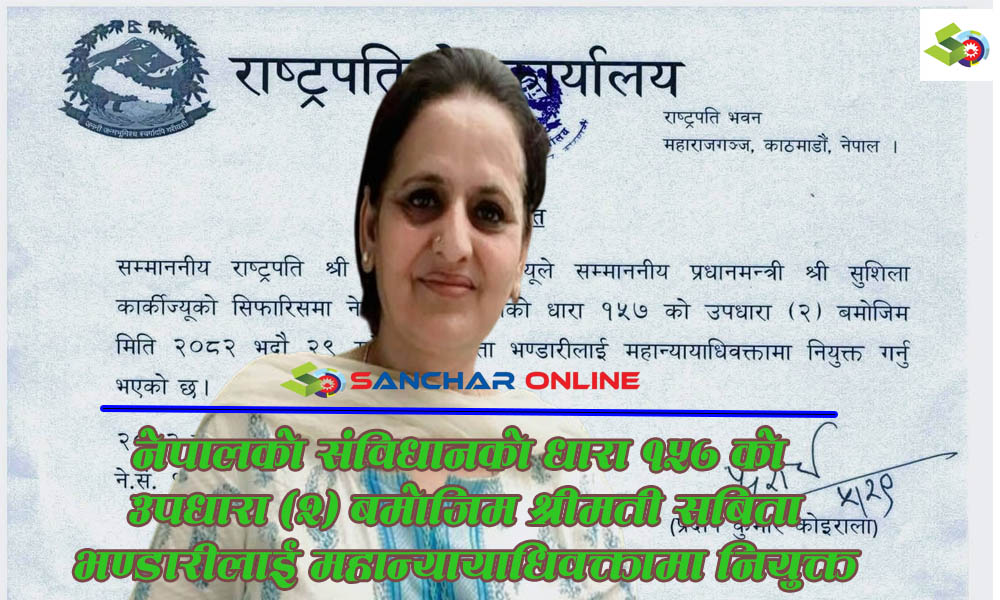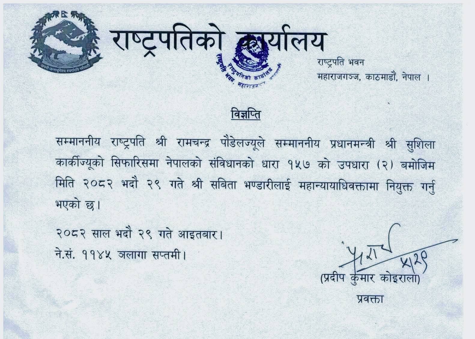 राष्ट्रपति कार्यालयले जारी विज्ञप्तिअनुसार, सम्माननीय राष्ट्रपति श्री रामचन्द्र पौडेलज्यूले प्रधानमन्त्री श्रीमती सुशिला कार्कीको सिफारिसअनुसार नेपालको संविधानको धारा १५७ को उपधारा (२) बमोजिम श्रीमती सबिता भण्डारीलाई महान्यायाधिवक्तामा नियुक्त गर्नुभएको छ।