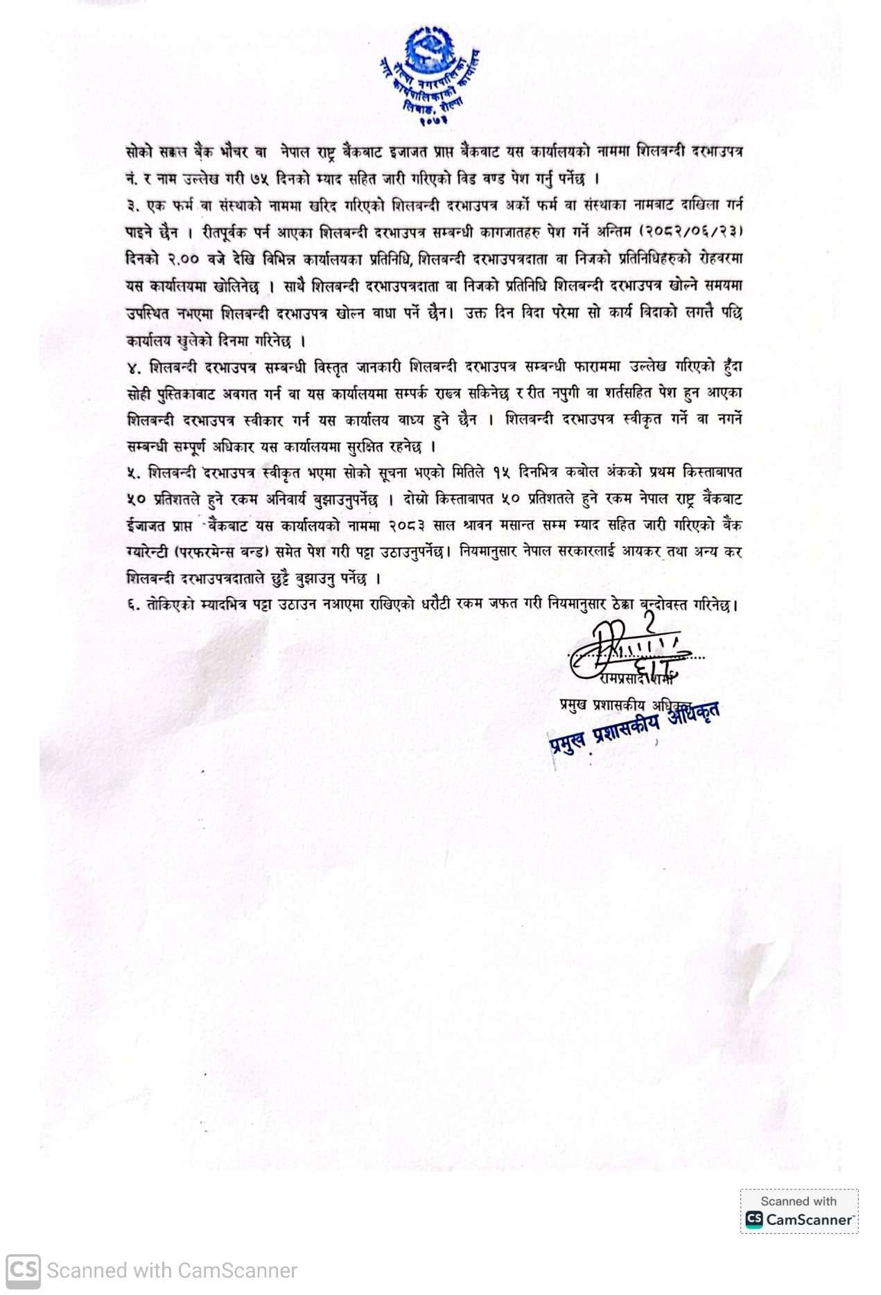 नगरपालिकाले दोस्रो पटक सूचना प्रकाशित गर्दै इच्छुक व्यक्ति, फर्म वा कम्पनीहरूले फर्मको नवीकरण प्रमाणपत्र, मूल्य अभिवृद्धि कर (भ्याट) दर्ता प्रमाणपत्र, आ.व. २०८१/०८२ को कर चुक्ता प्रमाणपत्र र नेपाली नागरिकताको प्रमाणपत्रको प्रमाणित प्रतिलिपिसहित तोकिएका शर्तअनुसार निवेदन दिनुपर्ने जनाएको छ।