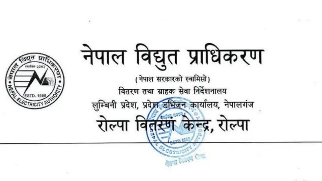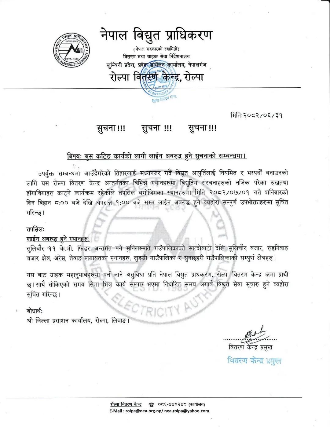 विद्युत अवरुद्धका कारण उपभोक्तामा पर्न सक्ने असुविधाप्रति नेपाल विद्युत प्राधिकरण, रोल्पा वितरण केन्द्रले क्षमायाचना गरेको छ ।