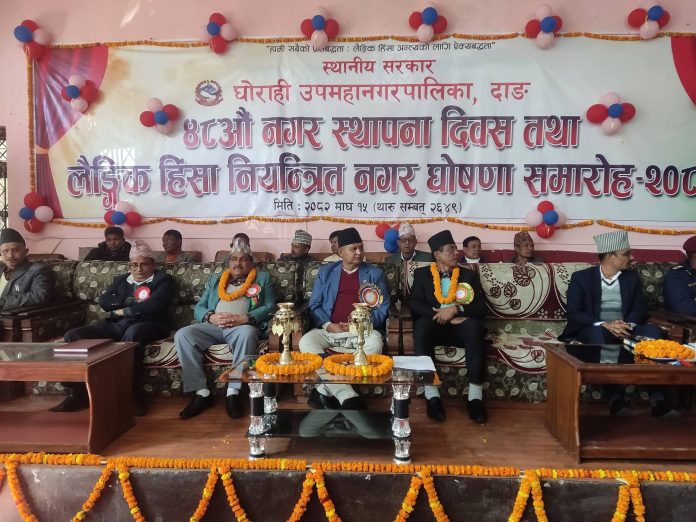 दाङ, १५ माघ । दाङकाे घाेराही उपमहानगरलाई नेपालकै पहिलाे लैंगिक हिंसा नियन्त्रित नगर घाेषणा गरिएको छ । लैंगिक हिंसा नियन्त्रण गर्नका लागि तय गरिएका सवै सूचक पुरा भएपछि नगरकाे ४८ ओैं स्थापना दिवसकाे अवसरमा बिहिवार घाेराहीमा आयाेजित कार्यक्रममा घाेराहीलाई लैंगिक हिंसा नियन्त्रित नगर घाेषणा गरिएको हाे ।
